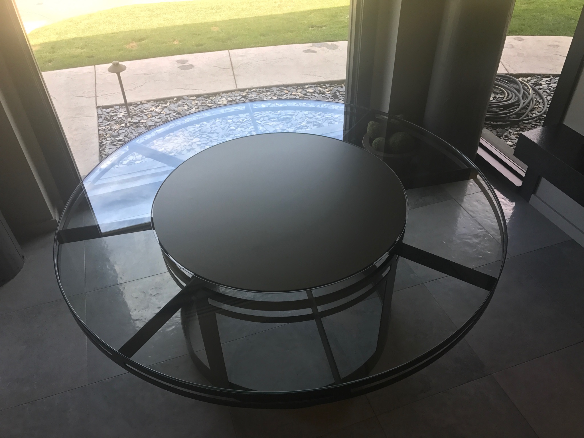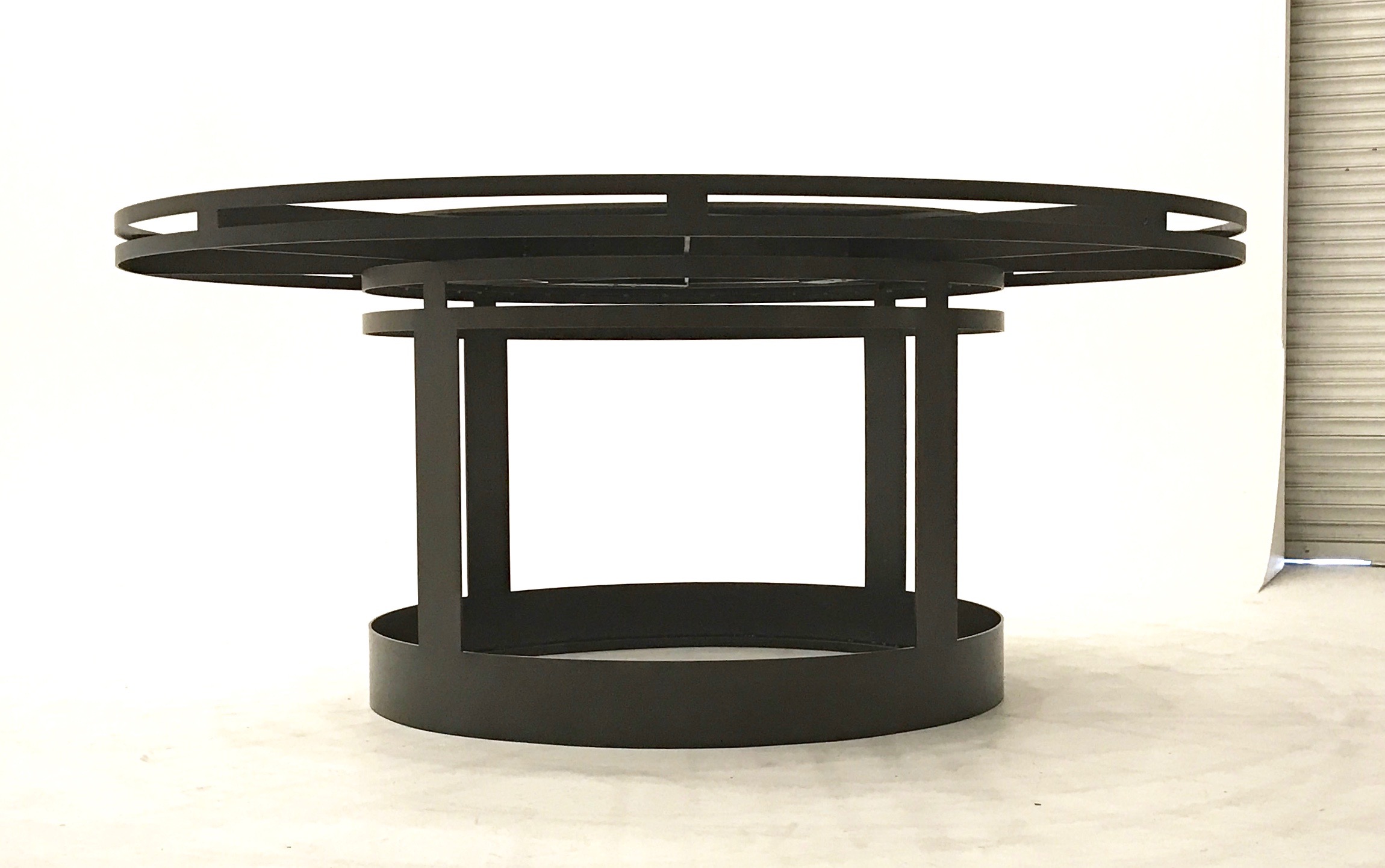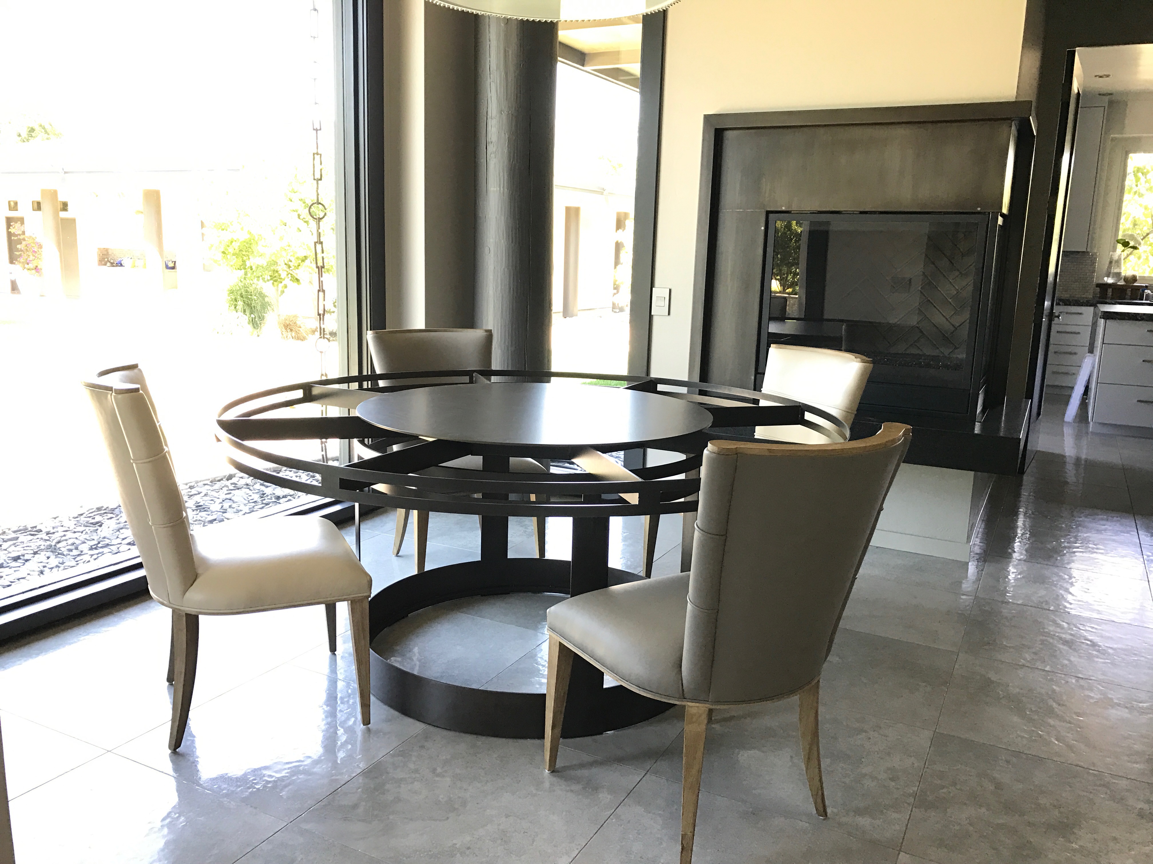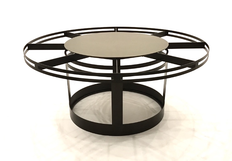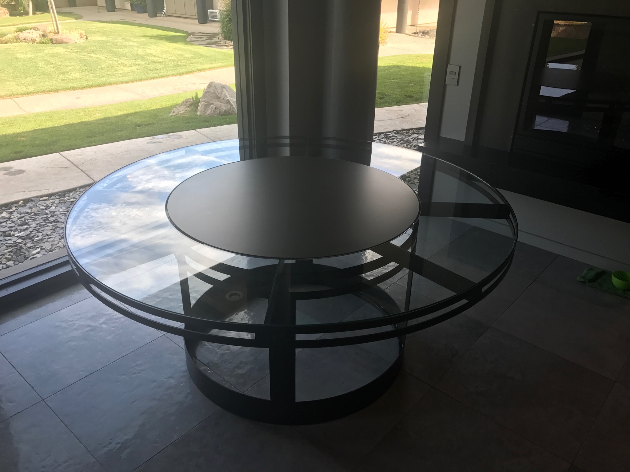 Dinning room table fabricated in steel. This 6′ diameter dinning table has a 36″ lazy Susan in the center with an over sized single piece glass top. Powder coated satin black.