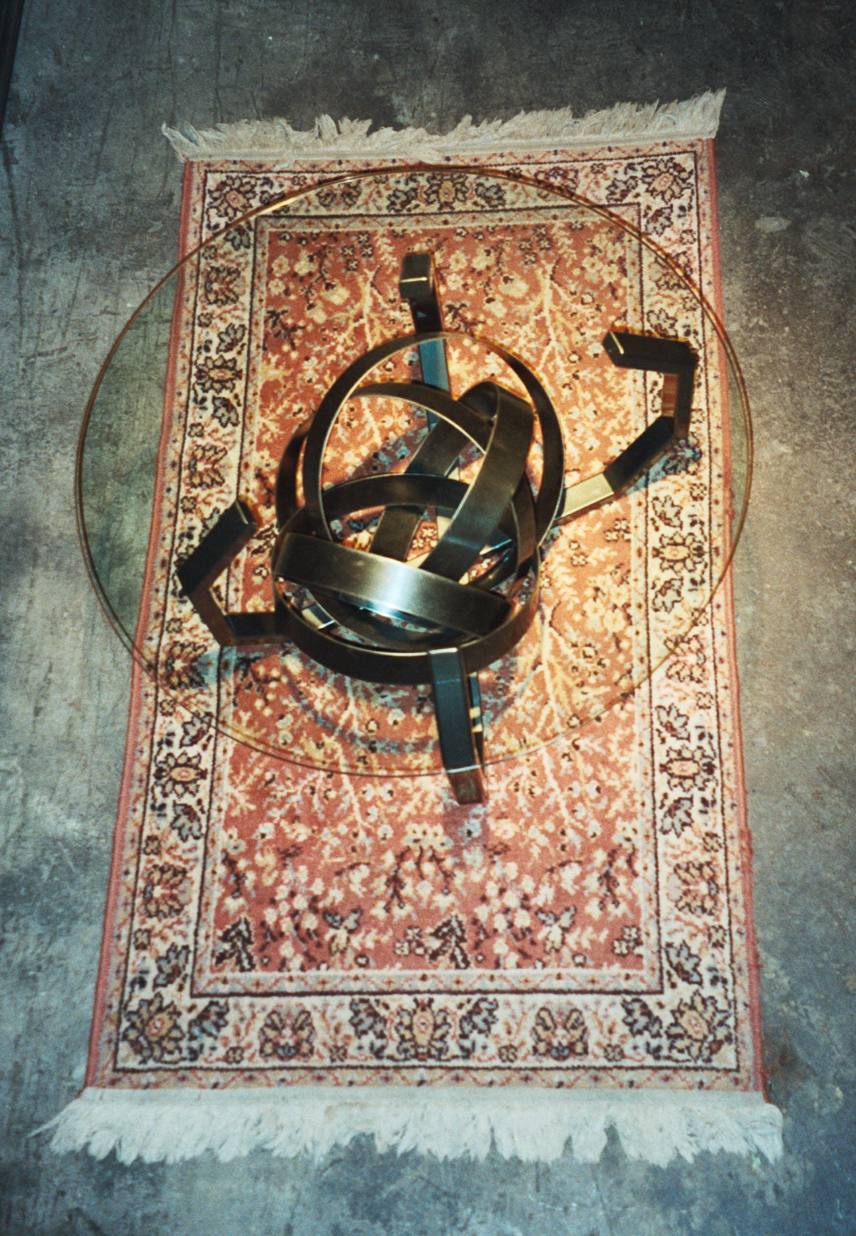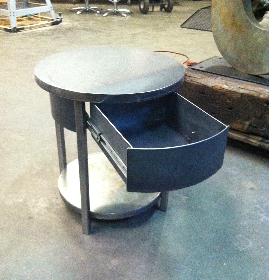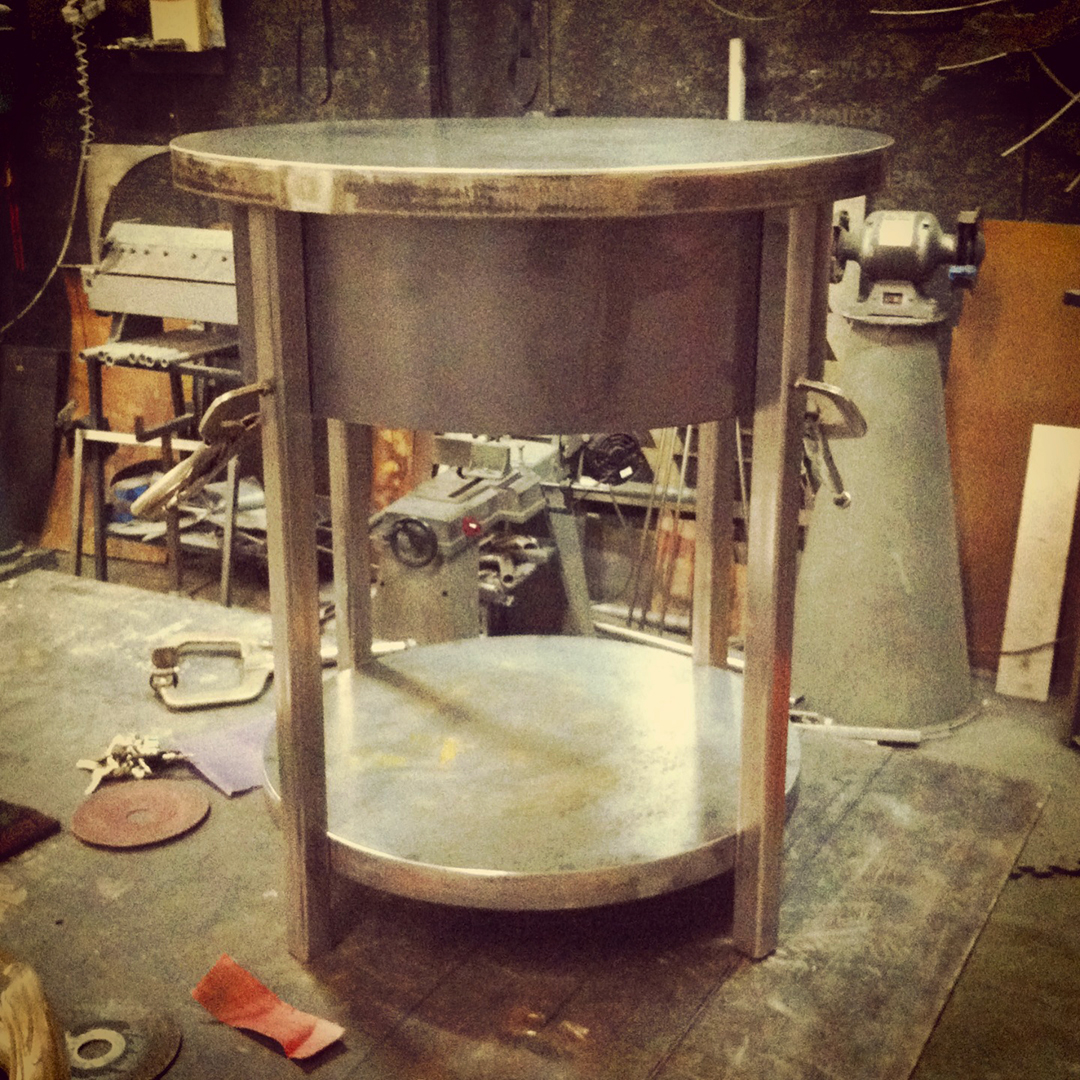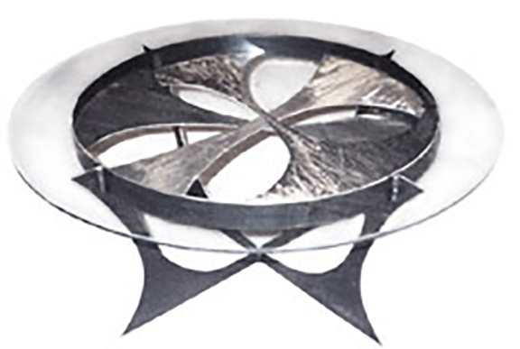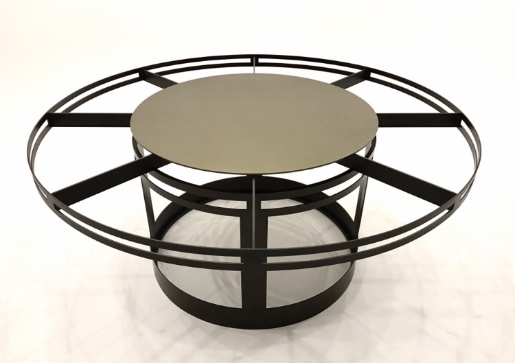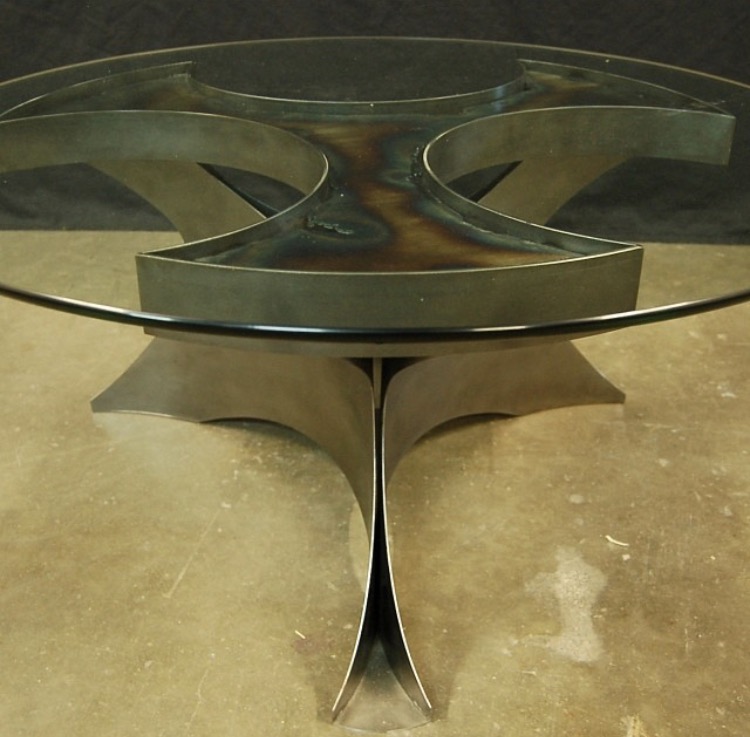 Dinning room table fabricated in steel. This 6′ diameter dinning table has a 36″ lazy Susan in the center with an over sized single piece glass top. Powder coated satin black.