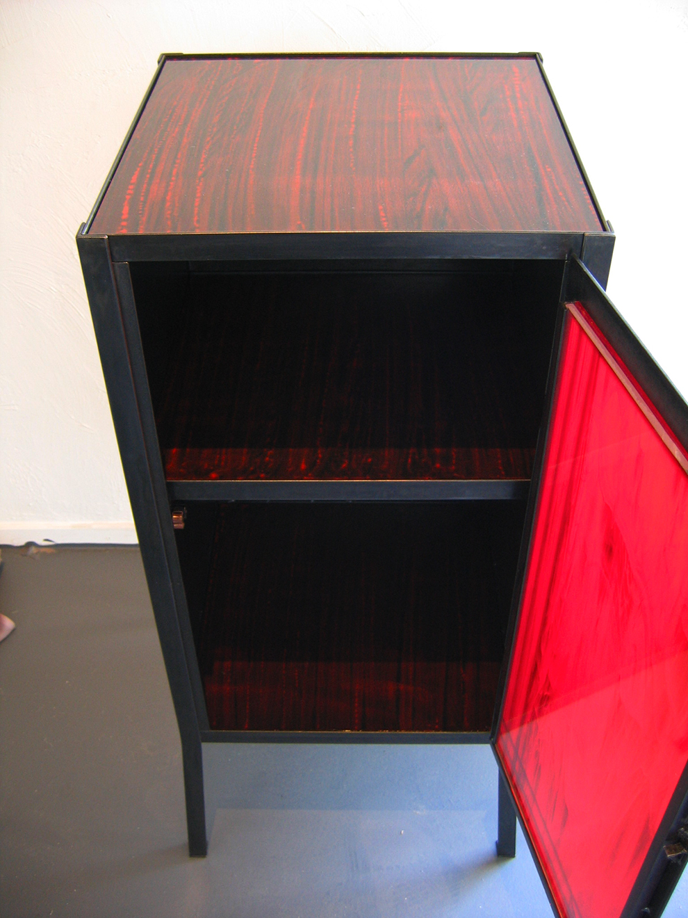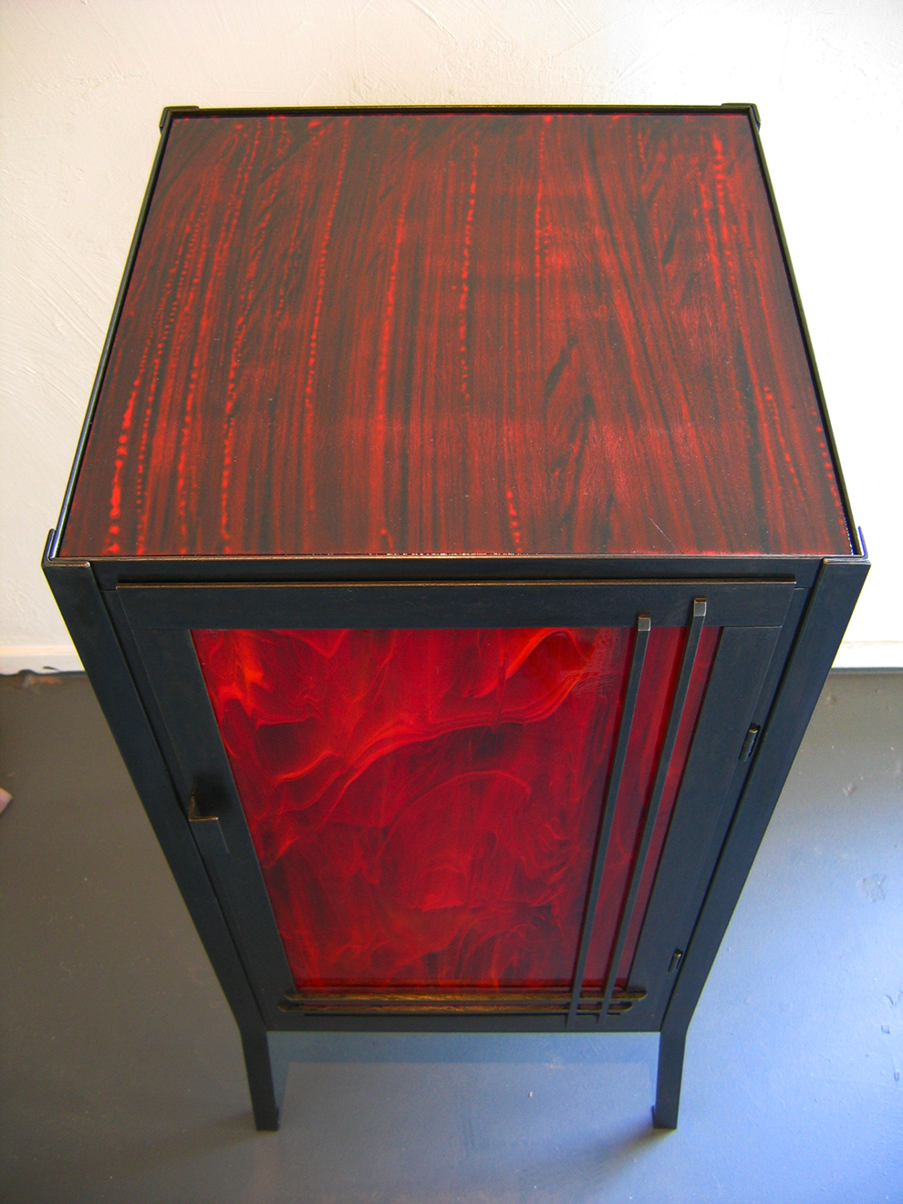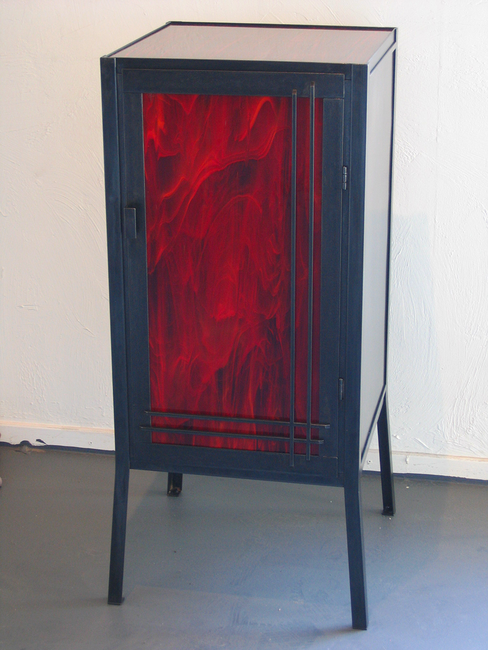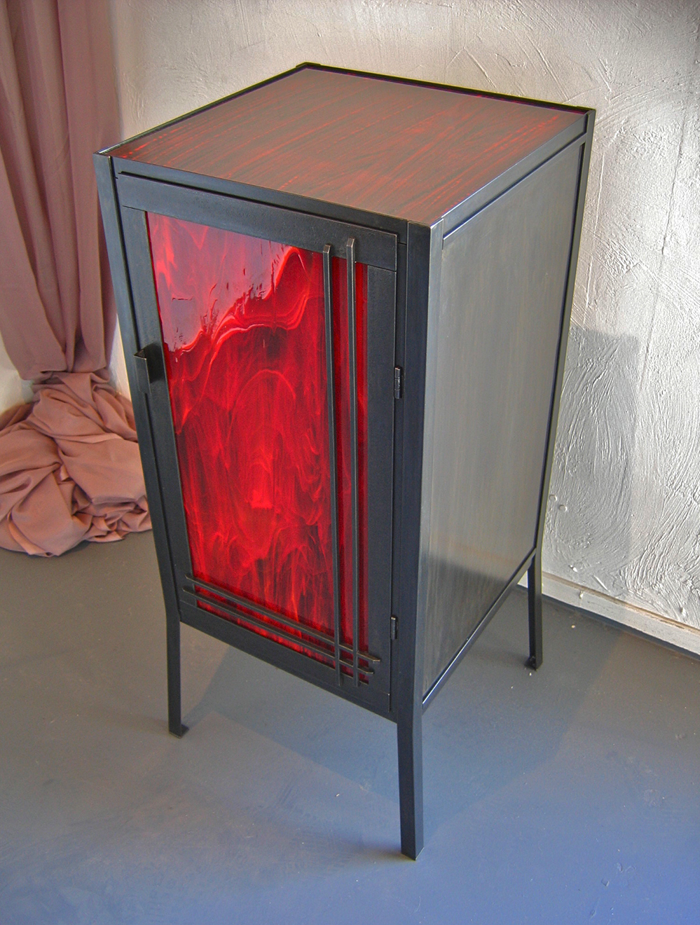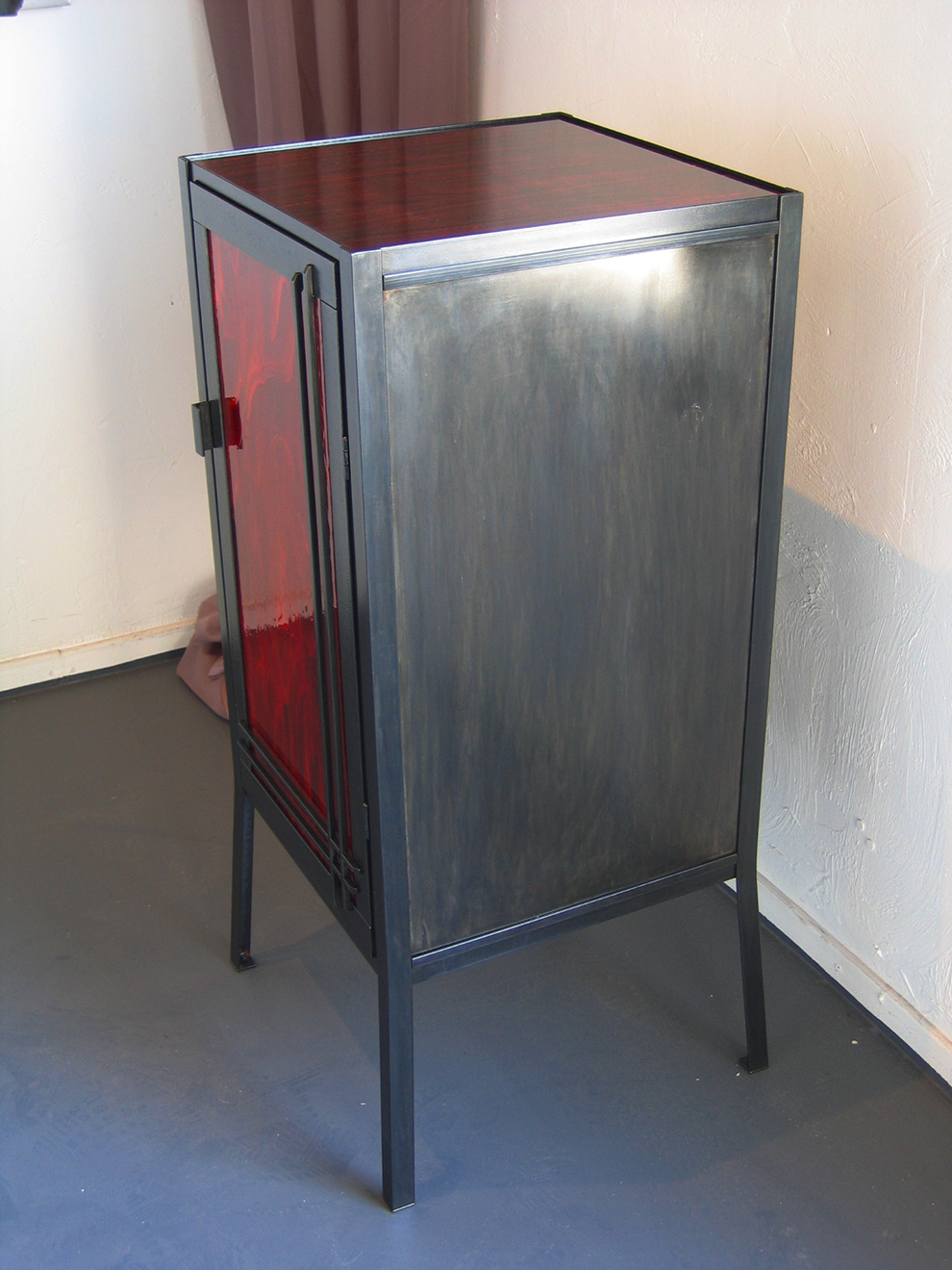 The Ruby Enclosure and end table, both 40″ x 16″ x 16″ The “Ruby” as these red enclosures and end tables came to be known, were designed and sold during my years working in Los Angeles. With a love of mid century modern as the inspiration, I wanted to reflect a more powerful, almost gothic, darker tone to what I would consider a strong, simple statement piece. The red stained glass that was used for the enclosure door, and the 100 year old ruby glass tiles used on the end tables which once lived in the lobby of a bank in Chicago, were just magnificent. Once I had those, everything fell into place.