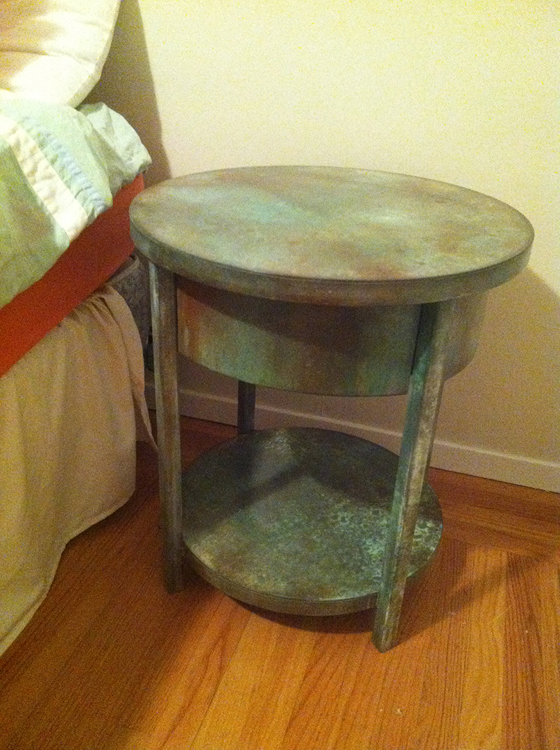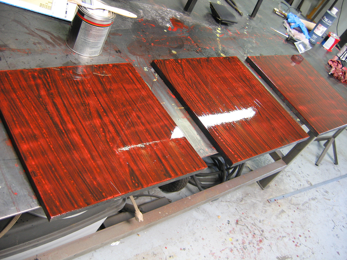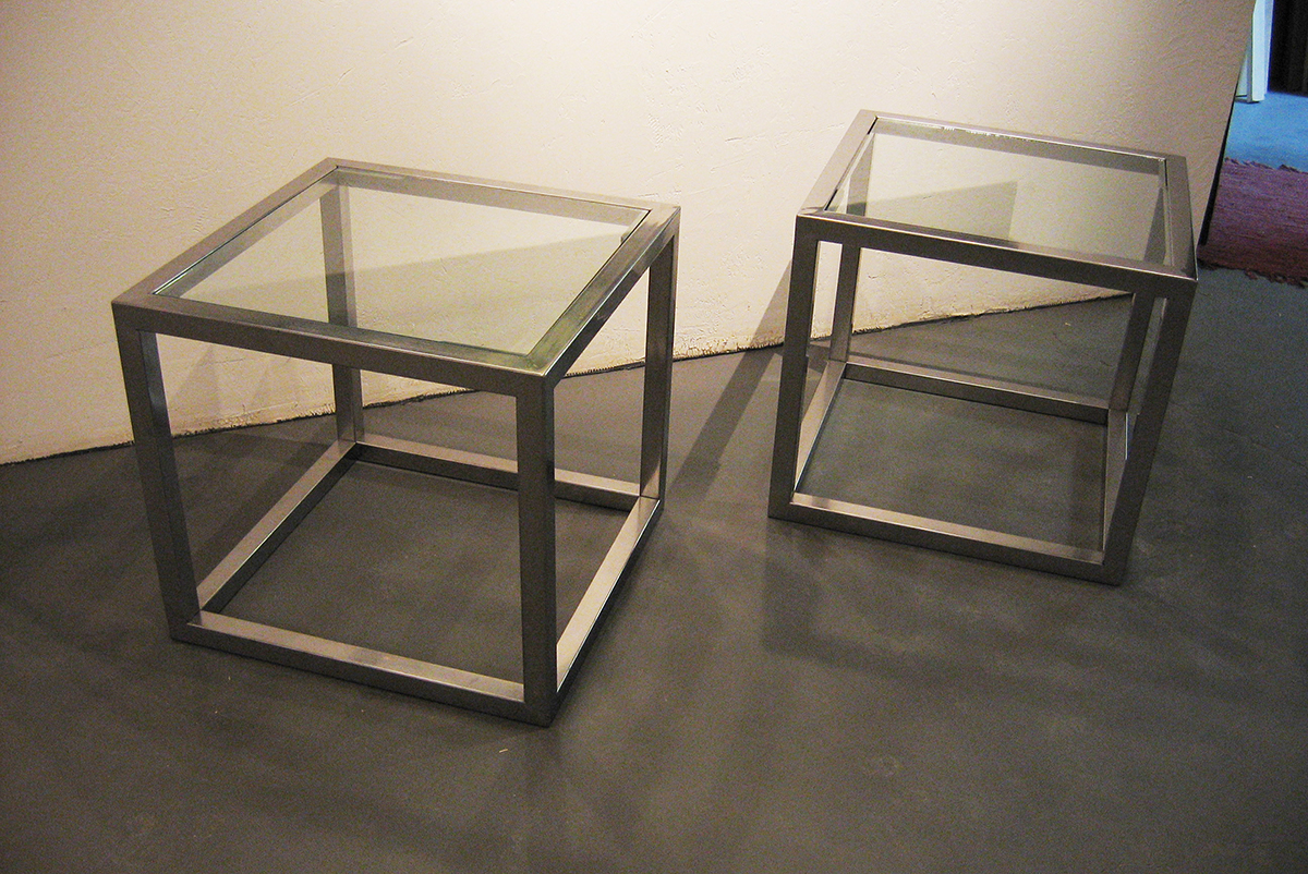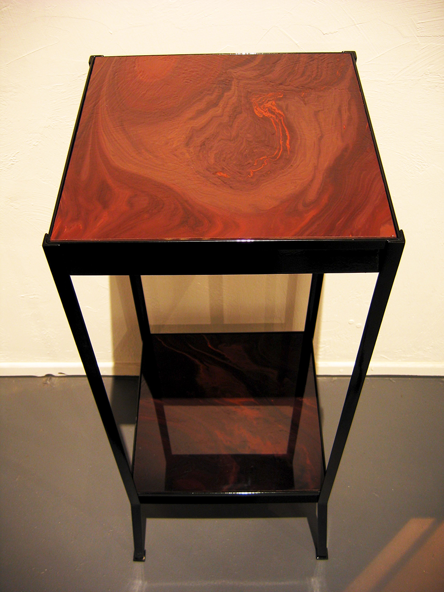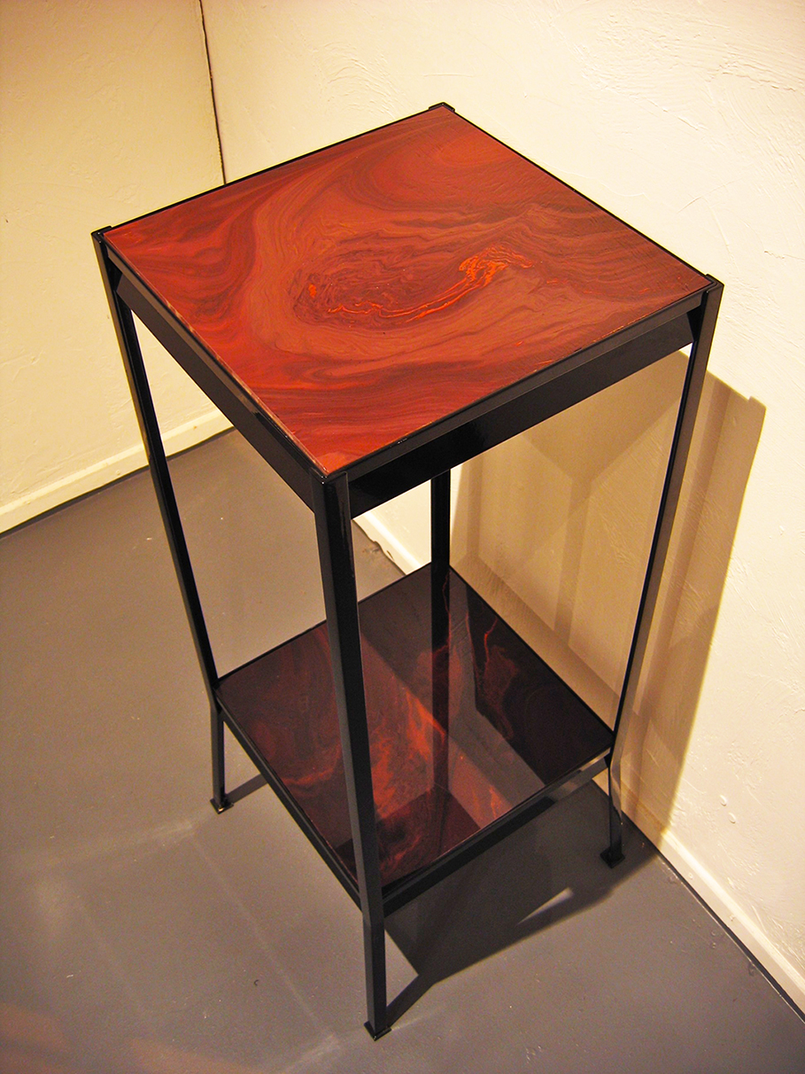 The Ruby Enclosure and end table, both 40″ x 16″ x 16″ The “Ruby” as these red enclosures and end tables came to be known, were designed and sold during my years working in Los Angeles. With a love of mid century modern as the inspiration, I wanted to reflect a more powerful, almost gothic, darker tone to what I would consider a strong, simple statement piece. The red stained glass that was used for the enclosure door, and the 100 year old ruby glass tiles used on the end tables which once lived in the lobby of a bank in Chicago, were just magnificent. Once I had those, everything fell into place.