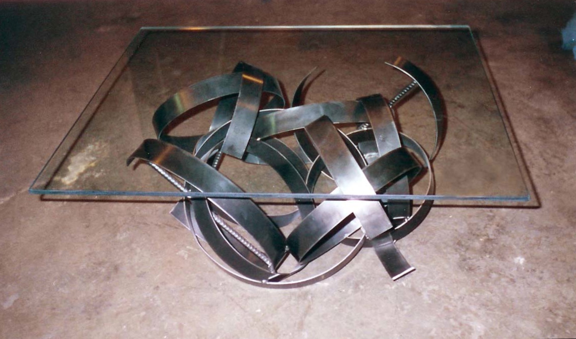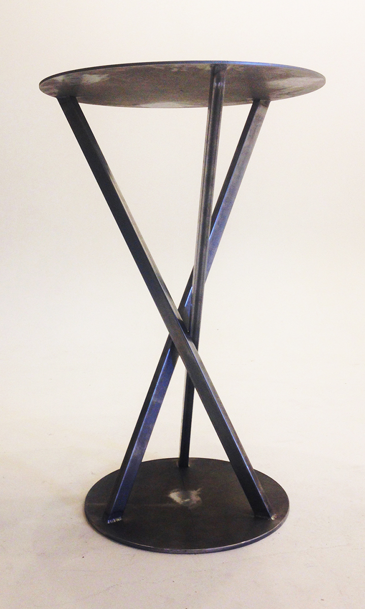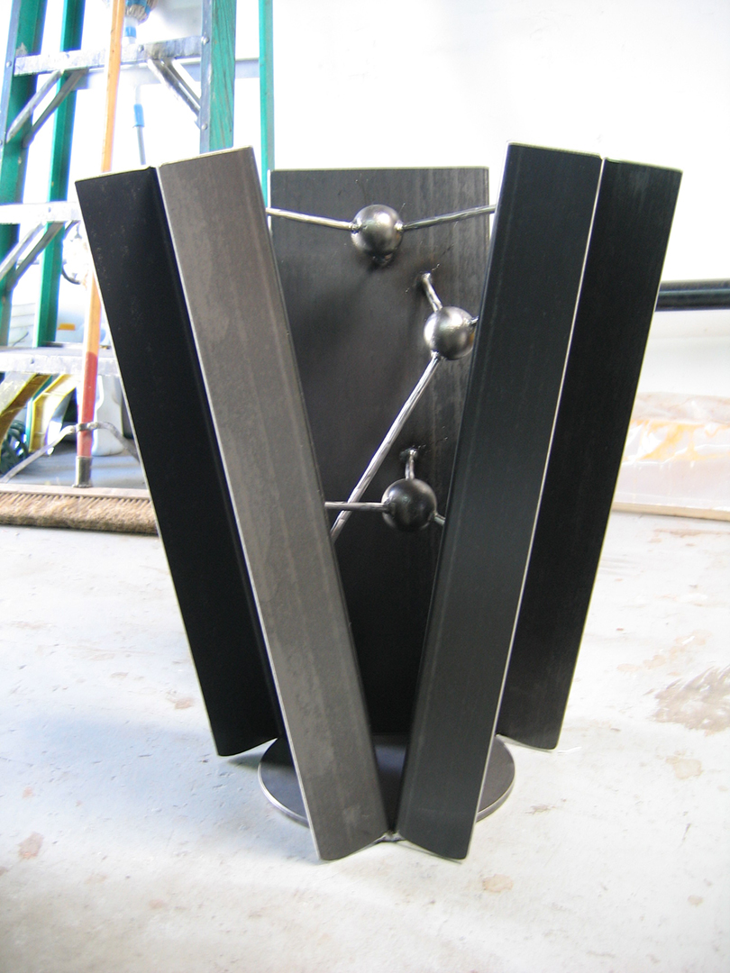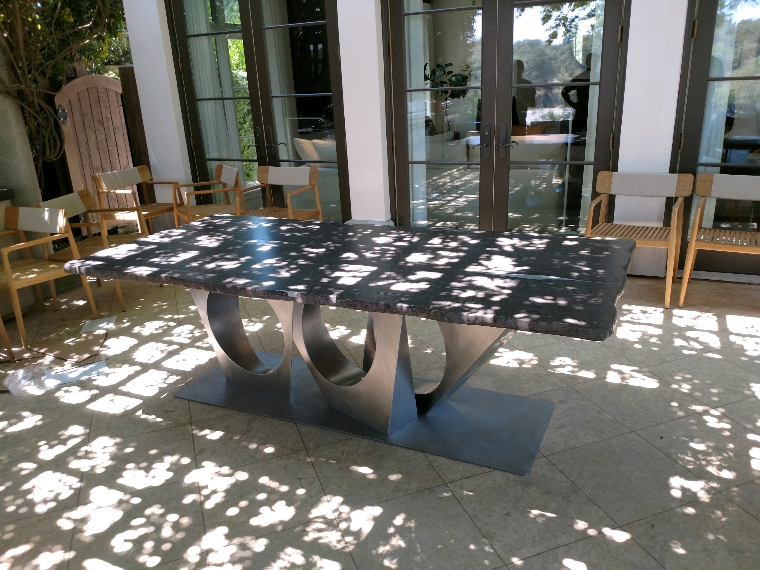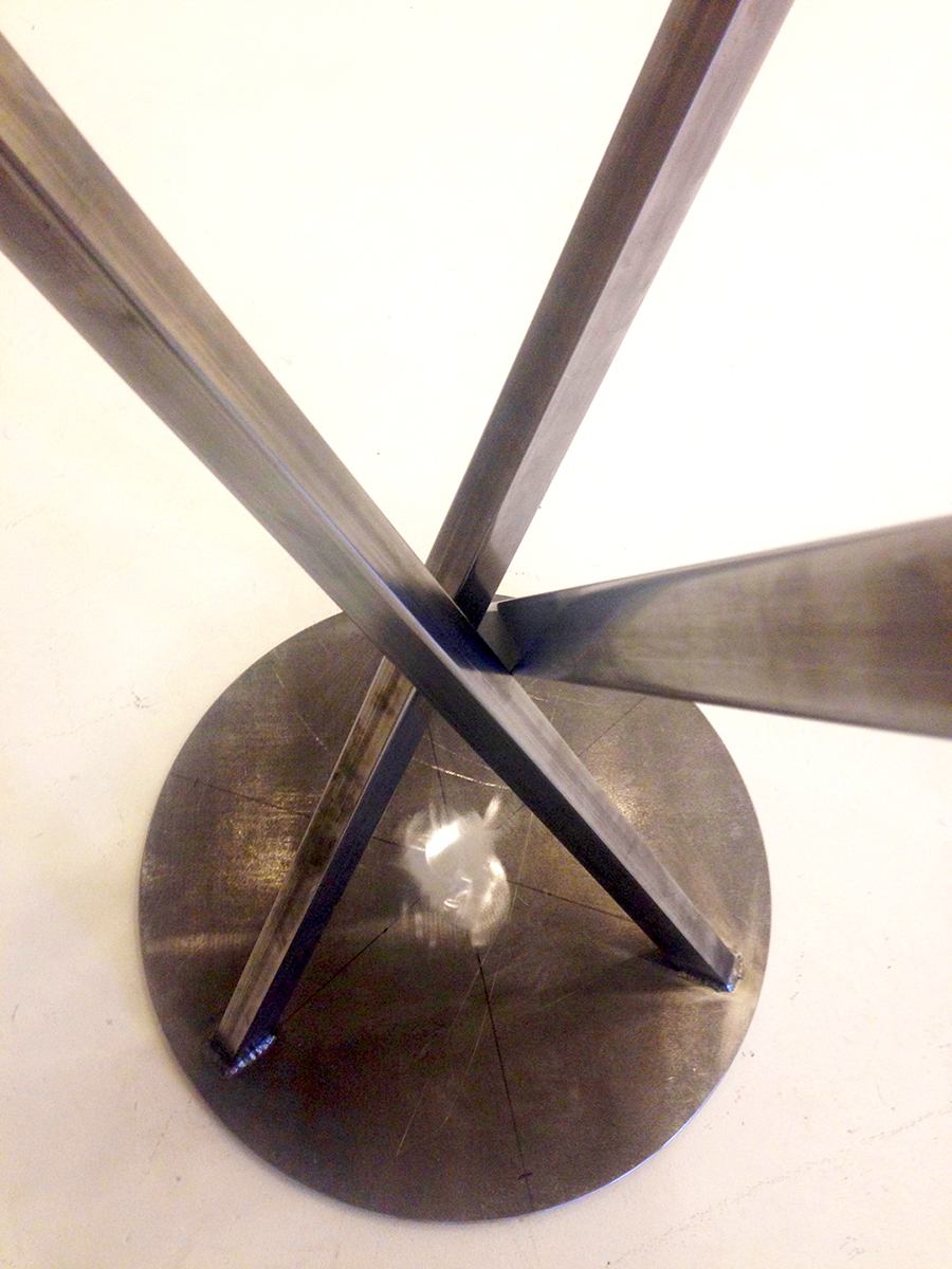 The “George” dinning table was inspired by a sculpture installation of mine on the property that consisted of two of these spikes in rusted steel. The table uses sections of the spike design as the body. All constructed in stainless steel with a granite top. Table top measures 3′ x 9′