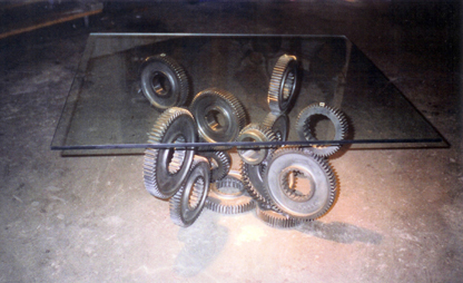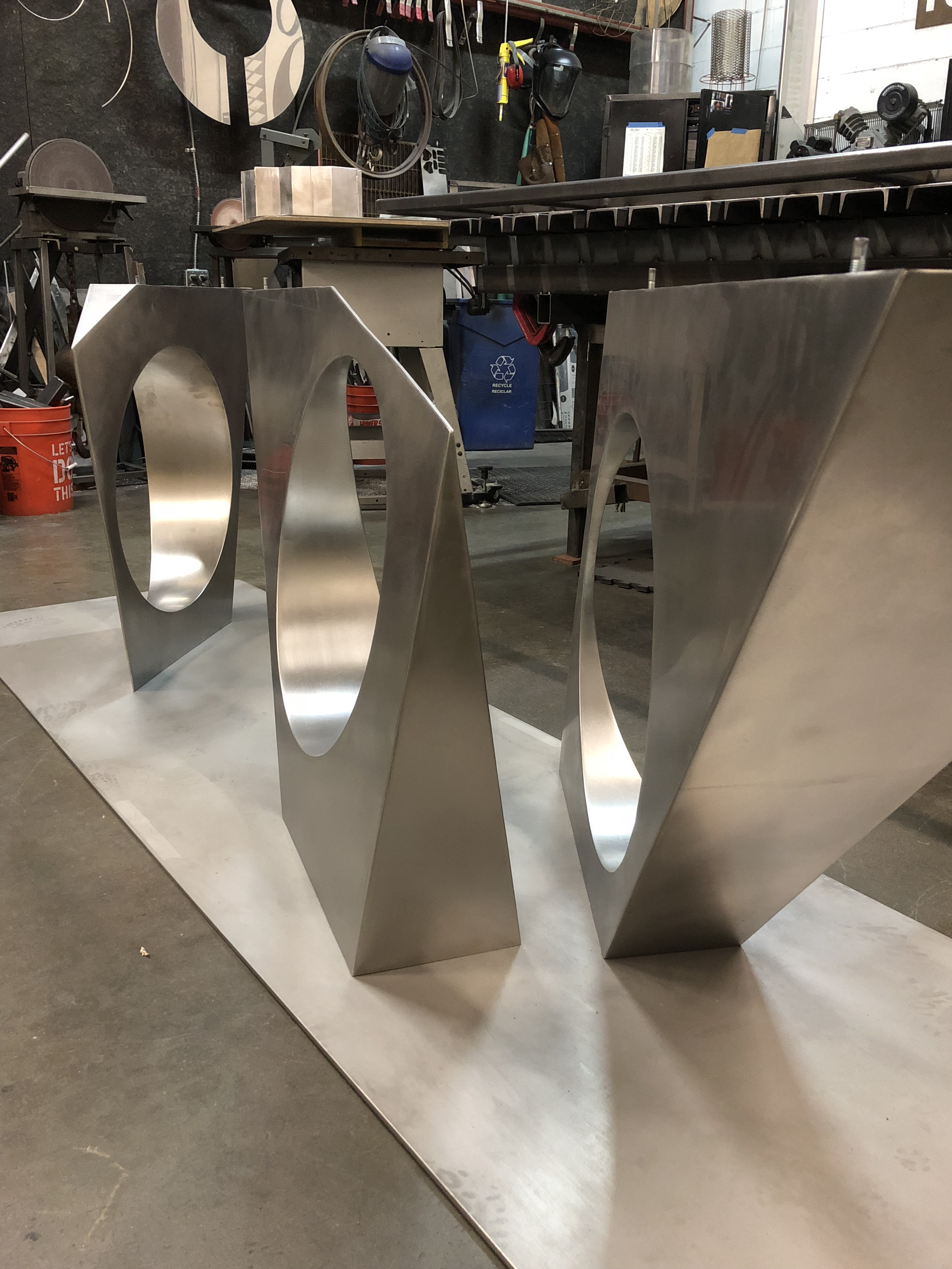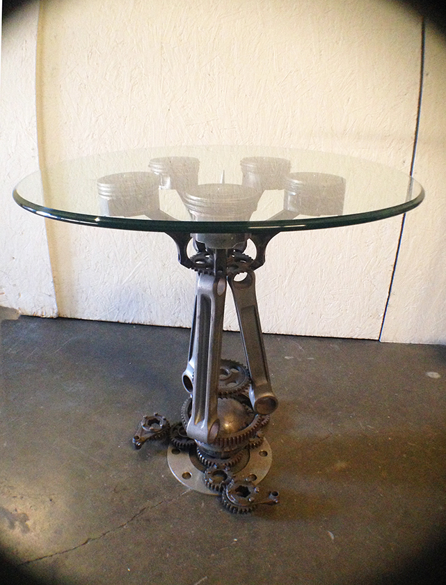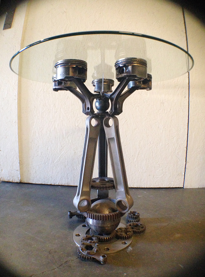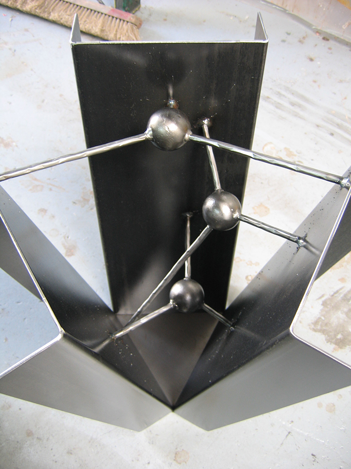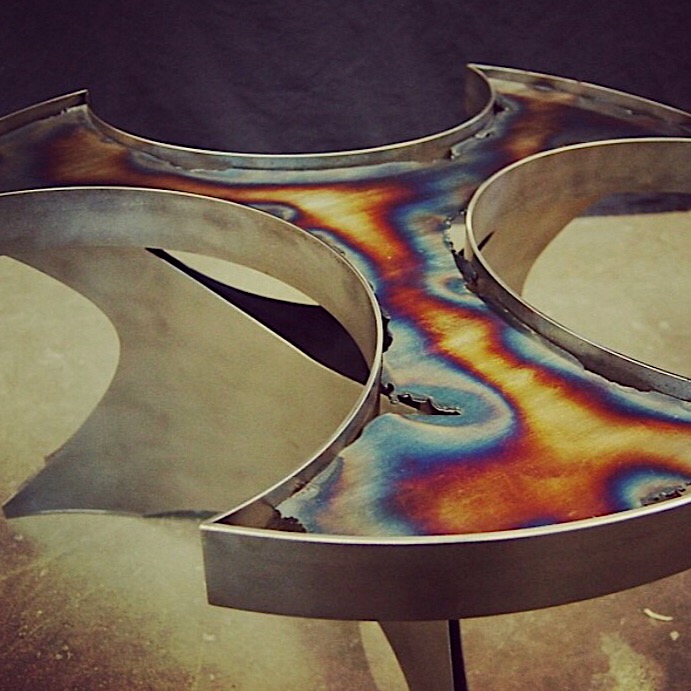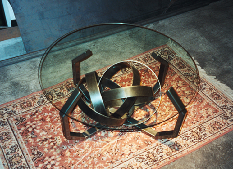 The “George” dinning table was inspired by a sculpture installation of mine on the property that consisted of two of these spikes in rusted steel. The table uses sections of the spike design as the body. All constructed in stainless steel with a granite top. Table top measures 3′ x 9′