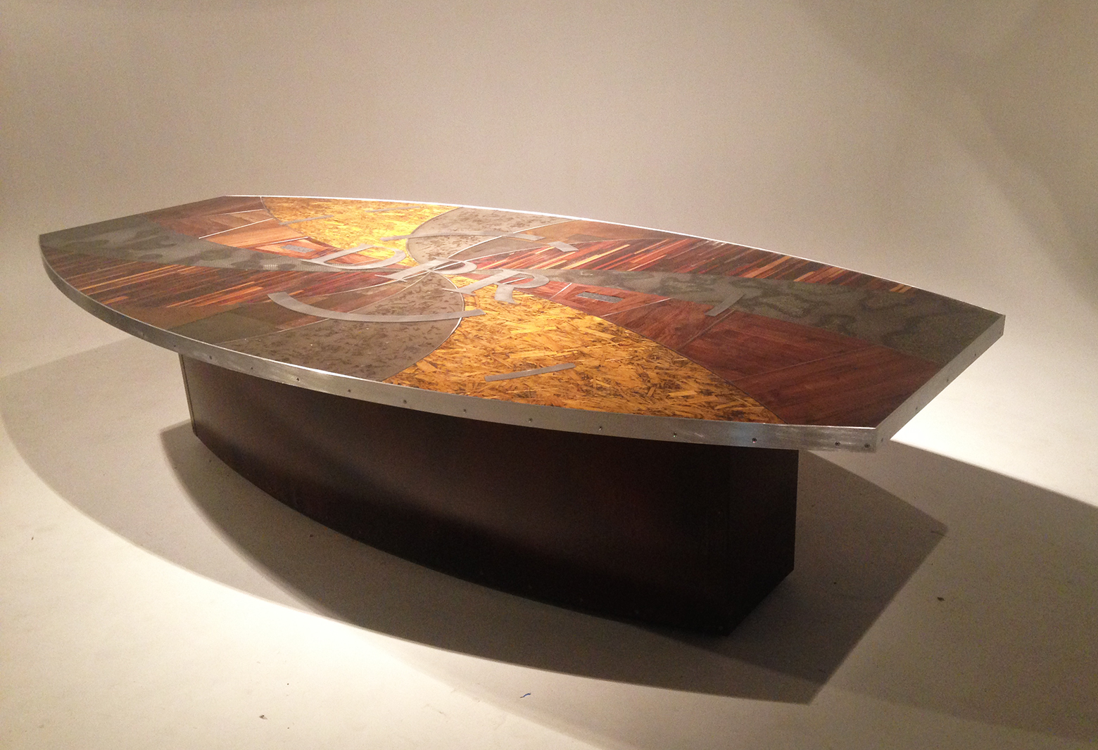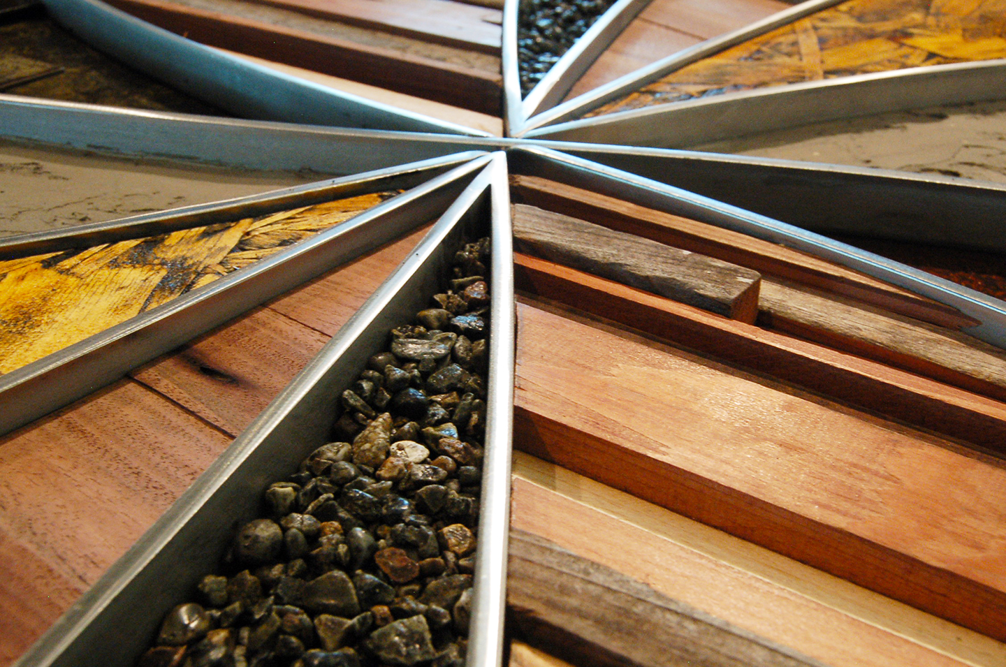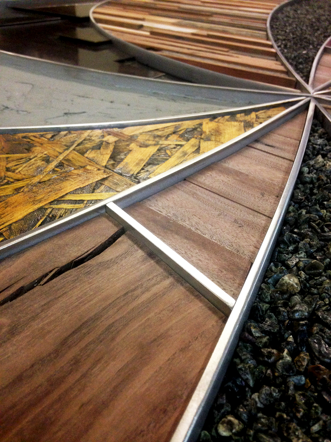 DPR Construction Conference Table. 10′ x 5′ The idea for the table was to highlight common construction materials. With a collection of woods, rocks, gravel, plywood, nuts, bolts and screws. The table top is wrapped in an aluminum band as a boarder, then the materials were incased in 39 gallons of resin. The stainless steel used for the pattern that separates the different sections of the top, is based off of a center focus design pattern. The base was shaped to follow the contour of the top and then patinaed with rust and Japanese brown color.