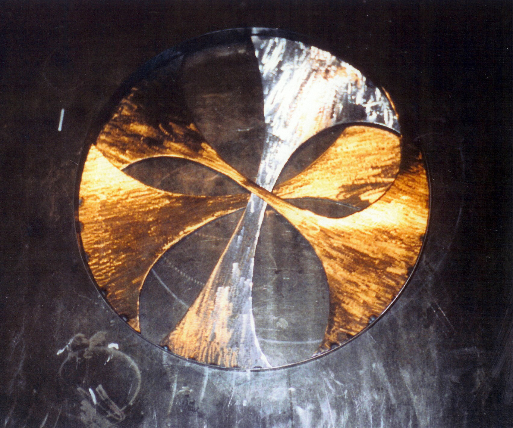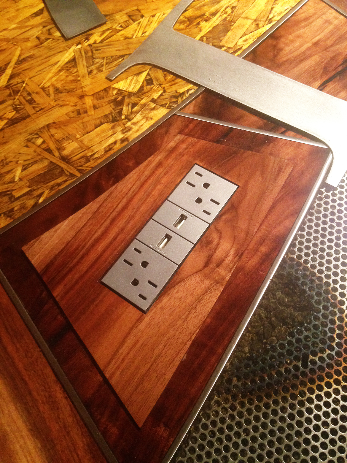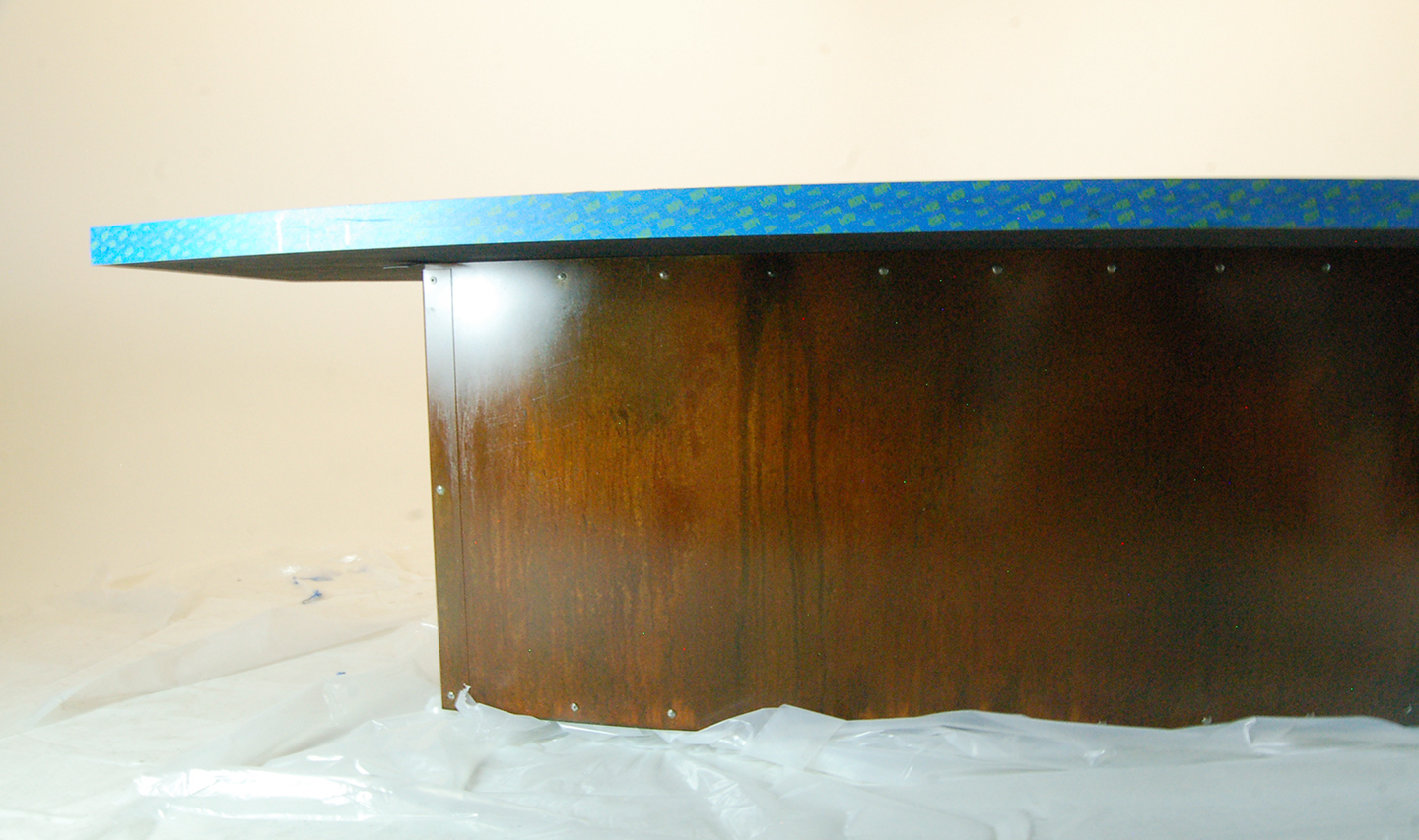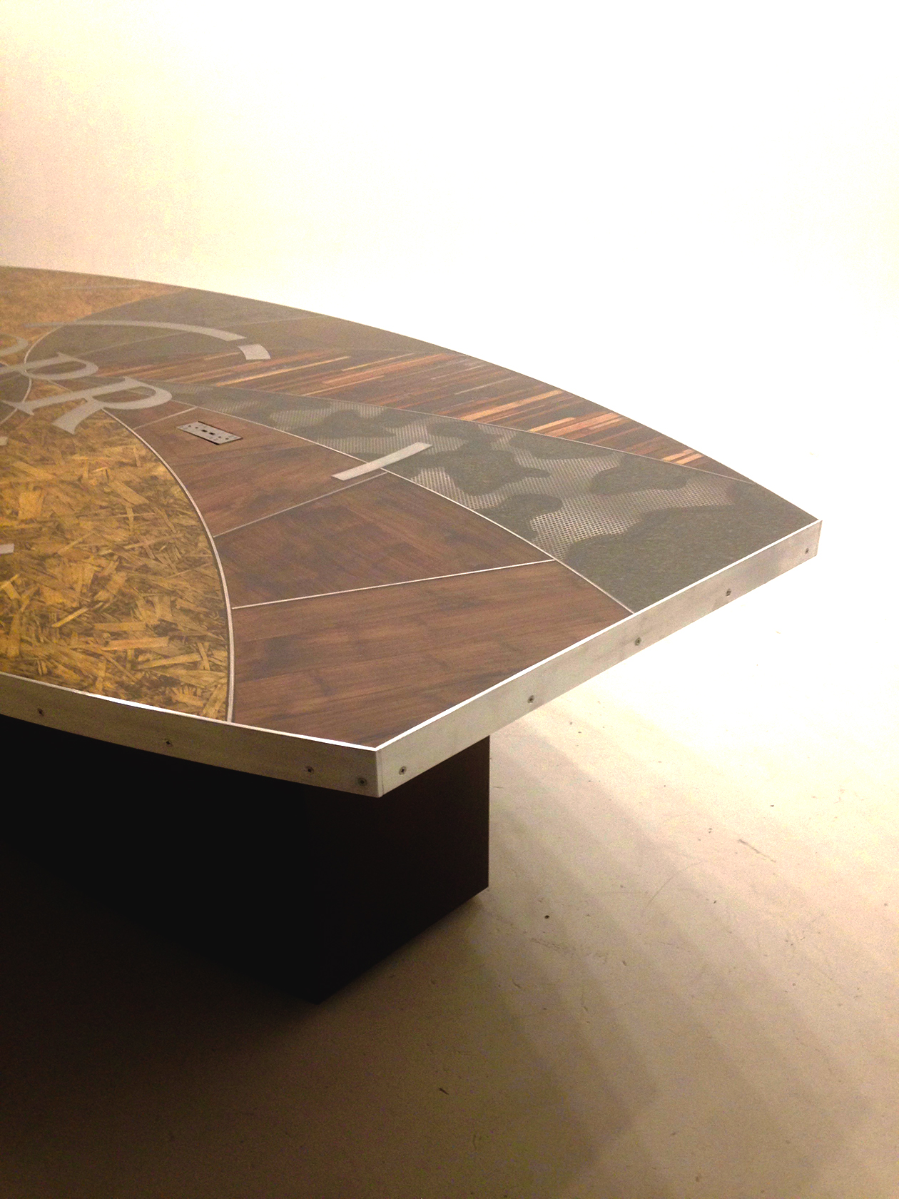 DPR Construction Conference Table. 10′ x 5′ The idea for the table was to highlight common construction materials. With a collection of woods, rocks, gravel, plywood, nuts, bolts and screws. The table top is wrapped in an aluminum band as a boarder, then the materials were incased in 39 gallons of resin. The stainless steel used for the pattern that separates the different sections of the top, is based off of a center focus design pattern. The base was shaped to follow the contour of the top and then patinaed with rust and Japanese brown color.